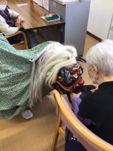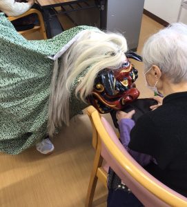 無病息災を祈り、獅子舞を行いご利用者様の頭や痛いところや治したいところに噛みつきました。